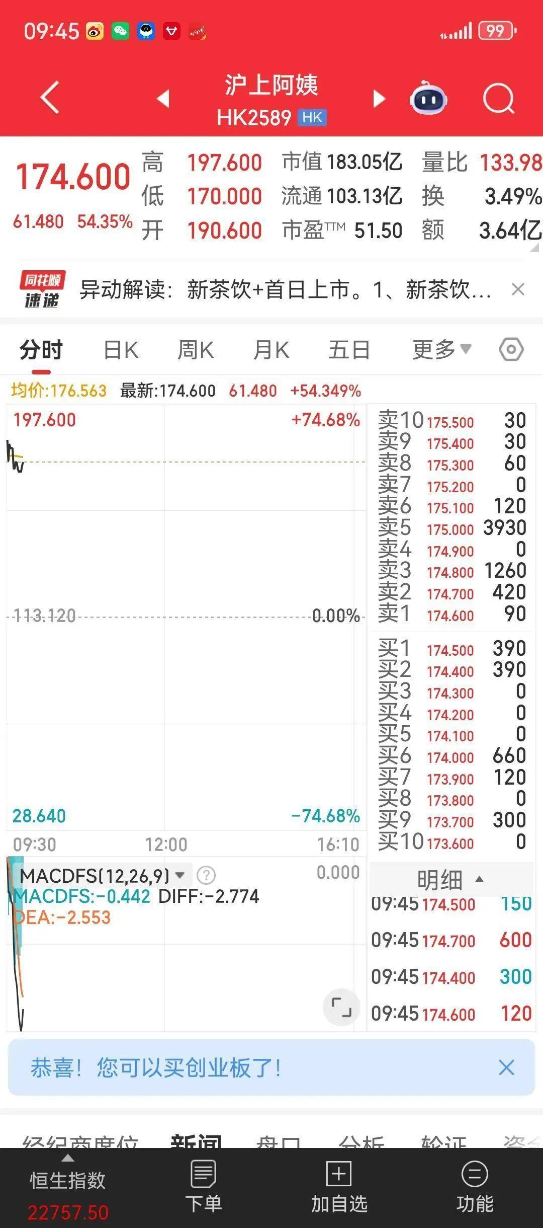 5 月 8 日(就在剛剛),茶飲行業(yè)再一次迎來重磅消息,滬上阿姨成功在港交所掛牌上市(股票代碼:2589),開盤報190.6港元,較113.12港元的發(fā)行價大漲68%,市值達到195.23億港元。